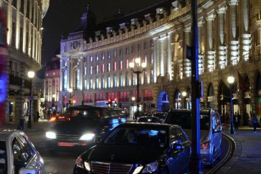 Linking Piccadilly to Oxford Circus and up to All Souls Church and the BBC Broadcasting House in the West End, Regent Street is a major shopping destination and well-known for its exuberant Christmas lights. Traditional shops like the Liberty department store and Hamleys toy shop stand side-by-side with international brands like Apple and Burberry. The first Abercrombie and Fitch superstore opened outside the U.S. is nearby in a former mansion at 7 Burlington Gardens.